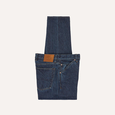 Cut with a slightly higher rise and a relaxed, tapered fit, the jeans are finished with copper rivets and a unique slanted pocket design.