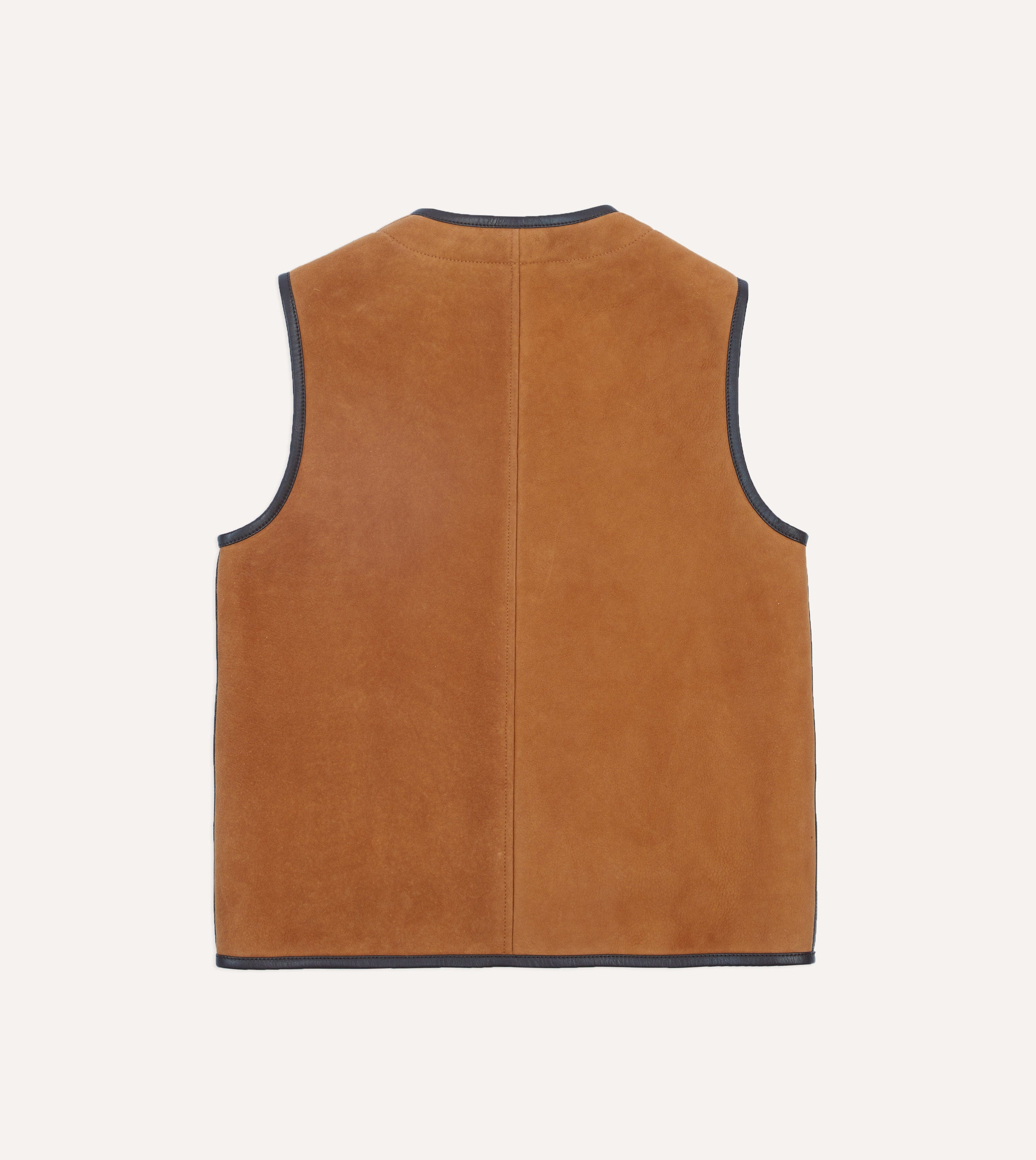 Working with an expert leather maker in Italy we created this snap button front vest, using a beautifully substantial suede. Rather than line the garment, we kept the shearling side of the suede, which faces inwards towards the wearer, ensuring maximum warmth.